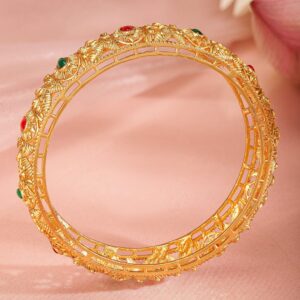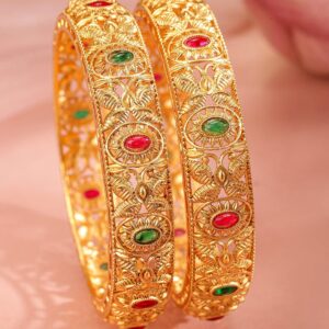 Bangle : This exquisite piece, ‘ Set Of 2 Gold-Plated Stone-Studded & Beaded Bangles’, is a perfect blend of elegance and craftsmanship. Designed to captivate, it reflects timeless beauty and intricate detailing. Ideal for special occasions, this accessory adds a touch of sophistication to your look. Made with high-quality materials, it guarantees durability and comfort. Elevate your style with this stunning creation, making you stand out effortlessly. Occasion : Bring your style to a whole new level with this handcrafted piece of jewellery. When you’re celebrating a special Occasion : – a birthday, wedding, or personal milestone – this piece adds that extra something that makes us feel special and looking our best. Material : & Care Material: Brass Net Weight: 42 Gram Net Quantity: 2 Bangles Care Label : It is advisable to avoid contact with water and organic chemicals i.e. perfume sprays. Store jewellery in airtight box. After use, wipe the jewellery with soft cotton cloth.