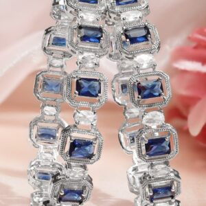 Bangle : This set of 2 rhodium-plated bangles features princess-cut blue sapphire AD stones and oval white zirconia, designed for premium party wear, special occasions, and contemporary glam styling. Perfect for Versatile Styling: These bangles complement traditional sarees and lehengas as well as fusion outfits, making them perfect for parties, festive dressing, or special events. Material : & Care Dimension : Net Weight : 45 Gram Material :Brass Net Quantity : 2 Bangles Care Label : It is advisable to avoid contact with water and organic chemicals i.e. perfume sprays. Store jewellery in airtight box. After use, wipe the jewellery with soft cotton cloth.