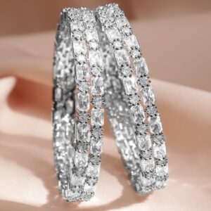 A stunning set of 2 rhodium-plated bangles, elegantly studded with white American Diamonds and Cubic Zirconia stones, designed to add a sparkling charm to your look. Material: Wipe with a clean, dry cloth to remove dust