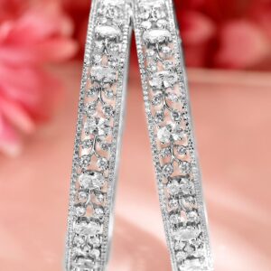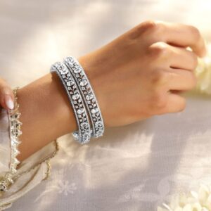 Bangle : Graceful rhodium-plated bangles adorned with premium cubic zirconia stones, offering a sophisticated sparkle to elevate any look. Occasion : Bring your style to a whole new level with this handcrafted piece of jewellery. When you’re celebrating a special Occasion : – a birthday, wedding, parties or personal milestone – this piece adds that extra something that makes us feel special and looking our best. Material & Care Material: Brass Plating : Rhodium-Plated Net Weight: 43 Gram Net Quantity: 2 Bangles Care Label : It is advisable to avoid contact with water and organic chemicals i.e. perfume sprays. Store jewellery in airtight box. After use, wipe the jewellery with soft cotton cloth.