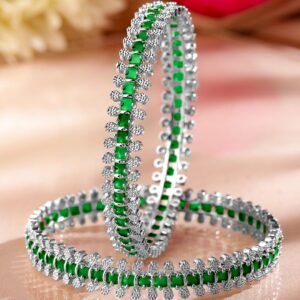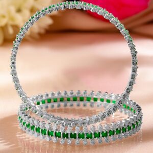 Bangles & Bracelet : A luxurious set of 2 rhodium-plated bangles, embellished with emerald green and white cubic zirconia. The exquisite craftsmanship and radiant sparkle make these bangles a timeless statement piece. Occasion : Bring your style to a whole new level with this handcrafted piece of jewellery. When you’re celebrating a special Occasion : – a birthday, wedding, or personal milestone – this piece adds that extra something that makes us feel special and looking our best. Material : & Care Net Weight: 45.09 g Net Quantity : 2 Bangles Material :Brass Care Label : It is advisable to avoid contact with water and organic chemicals i.e. perfume sprays. Store jewellery in airtight box. After use, wipe the jewellery with soft cotton cloth.
