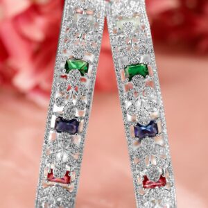 Bangle :Elevate your elegance with these Rhodium-plated bangles featuring multicolor AAA cubic zirconia stones and intricate handcrafted floral designs. Perfect for enhancing both ethnic and contemporary looks. Occasion : Bring your style to a whole new level with this handcrafted piece of jewellery. When you’re celebrating a special Occasion : – parties, festive, wedding, or personal milestone – this piece adds that extra something that makes us feel special and looking our best. Material & Care Material: Brass Plating : Rhodium Plated Net Weight: 51.56 g Net Quantity: 2 Bangles Care Label : It is advisable to avoid contact with water and organic chemicals i.e. perfume sprays. Store jewellery in airtight box. After use, wipe the jewellery with soft cotton cloth.