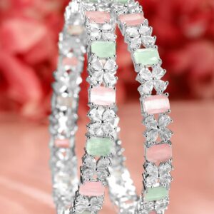 Bangle : A stunning pair of rhodium-plated bangles featuring pastel green and pink stones, complemented by dazzling cubic zirconia accents, perfect for adding elegance to any ensemble. Occasion : Bring your style to a whole new level with this handcrafted piece of jewellery. When you’re celebrating a special Occasion : – a birthday, wedding, festive or personal milestone – this piece adds that extra something that makes us feel special and looking our best. Material & Care Material: Brass Plating : Rhodium Plated Net Weight: 44.28 Gram Net Quantity: 2 Bangles Care Label : It is advisable to avoid contact with water and organic chemicals i.e. perfume sprays. Store jewellery in airtight box. After use, wipe the jewellery with soft cotton cloth.