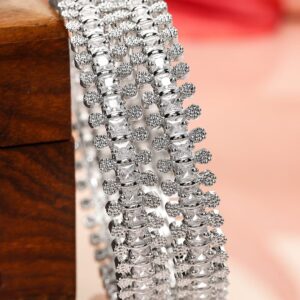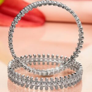 Bangle : This set of 2 rhodium-plated bangles features exquisite white cubic zirconia stones, enhancing their timeless elegance. The intricate handcrafted design with shimmering embellishments makes them ideal for festive and wedding looks. Occasion : Bring your style to a whole new level with this handcrafted piece of jewellery. When you’re celebrating a special Occasion : – a birthday, wedding, festive or personal milestone – this piece adds that extra something that makes us feel special and looking our best. Material & Care Material: Brass Plating : Rhodium Plated Net Weight: 45.09 Gram Net Quantity: 2 Bangles Care Label : It is advisable to avoid contact with water and organic chemicals i.e. perfume sprays. Store jewellery in airtight box. After use, wipe the jewellery with soft cotton cloth.