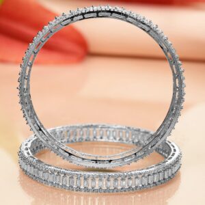 Enhance your elegance with ‘ set of 2 silver-plated bangles. Adorned with AD and cubic zirconia stones, these bangles offer a perfect blend of timeless style and modern sparkle. Occasion : Bring your style to a whole new level with this handcrafted piece of jewellery. When you’re celebrating a special Occasion : – a birthday, wedding, festive or personal milestone – this piece adds that extra something that makes us feel special and looking our best. Material & Care Material: Brass Plating : Silver Plated Net Weight: 50 Gram Net Quantity: 2 Bangles Care Label: It is advisable to avoid contact with water and organic chemicals i.e. perfume sprays. Store jewellery in airtight box. After use, wipe the jewellery with soft cotton cloth.