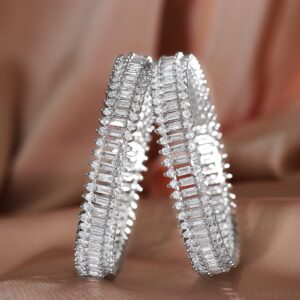 This set of 2 bangles features dazzling AD and cubic zirconia stones in a sleek silver-plated finish, offering a refined and radiant look ideal for festive and special occasions. Occasion : Bring your style to a whole new level with this handcrafted piece of jewellery. When you’re celebrating a special Occasion : – a birthday, wedding, festive or personal milestone – this piece adds that extra something that makes us feel special and looking our best. Material & Care Material: Brass Plating : Silver Plated Net Weight: 50 Gram Net Quantity: 2 Bangles Care Label: It is advisable to avoid contact with water and organic chemicals i.e. perfume sprays. Store jewellery in airtight box. After use, wipe the jewellery with soft cotton cloth.