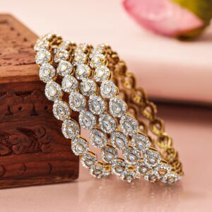 Bangle : Discover the elegance of Set of 4 18K Mehandi Gold-Plated Kundan & Cubic Zirconia Studded Handcrafted Bangle. This piece combines quality craftsmanship with a timeless design, making it perfect for any occasion. Elevate your style effortlessly and enjoy compliments on your refined taste. A must-have addition to your jewelry collection. Occasion : Bring your style to a whole new level with this handcrafted piece of jewellery. When you’re celebrating a special Occasion : – a birthday, wedding, or personal milestone – this piece adds that extra something that makes us feel special and looking our best. Material : & Care Material :Brass Weight : 60.67g Net Qnty : 4 Bangles Care Label : It is advisable to avoid contact with water and organic chemicals i.e. perfume sprays. Store jewellery in airtight box. After use, wipe the jewellery with soft cotton cloth.