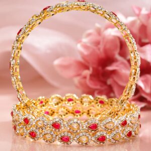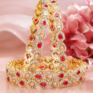 Bangle : Set of 4 18K mehandi gold-plated bangles studded with ruby pink gemstones, white kundan and sparkling zirconia. Crafted for bridal elegance, festive looks and ethnic celebrations. Ideal for Special Occasions: Perfect for bridal wear, festivals, and traditional events, these bangles pair beautifully with sarees, lehengas, and festive suits for a complete ethnic statement. Material : & Care Dimension : Net Weight: 64.47 g Net Quantity: 4 Bangles Material : Brass Care Label : It is advisable to avoid contact with water and organic chemicals i.e. perfume sprays. Store jewellery in airtight box. After use, wipe the jewellery with soft cotton cloth.