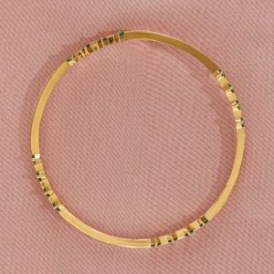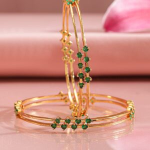 Bangle : A set of 4 handcrafted bangles in 22K gold-plating, embellished with delicate emerald green stones, offering a premium and elegant look. Occasion : Bring your style to a whole new level with this handcrafted piece of jewellery. When you’re celebrating a special Occasion : – a birthday, wedding, or personal milestone – this piece adds that extra something that makes us feel special and looking our best. Material : & Care Dimension : Net Weight: 26,97 g Net Quantity: 4 Bangles Material :Brass Care Label : It is advisable to avoid contact with water and organic chemicals i.e. perfume sprays. Store jewellery in airtight box. After use, wipe the jewellery with soft cotton cloth.