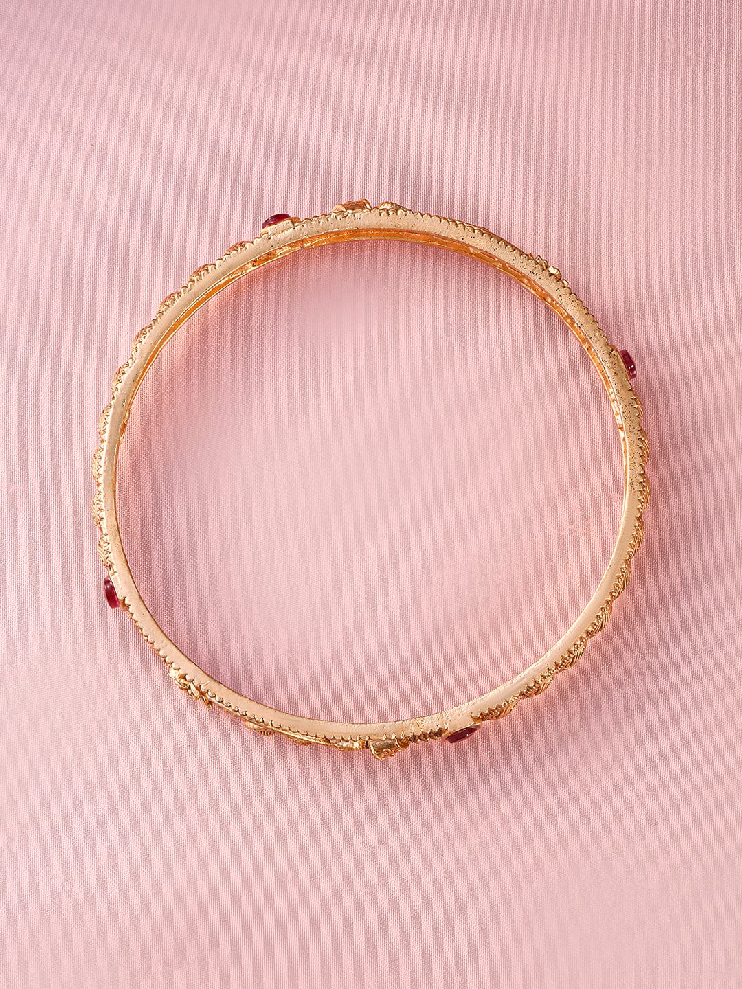 Bangle : This set of 4 bangles is crafted with intricate filigree work and 22K gold plating. Each bangle is adorned with ruby pink stones, offering a rich traditional look that’s perfect for enhancing ethnic attire. Occasion : Bring your style to a whole new level with this handcrafted piece of jewellery. When you’re celebrating a special Occasion : – a birthday, wedding, or personal milestone – this piece adds that extra something that makes us feel special and looking our best. Material : & Care Dimension : Net Weight: 68,21 g Net Quantity: 4 Bangles Material :Brass Care Label : It is advisable to avoid contact with water and organic chemicals i.e. perfume sprays. Store jewellery in airtight box. After use, wipe the jewellery with soft cotton cloth.