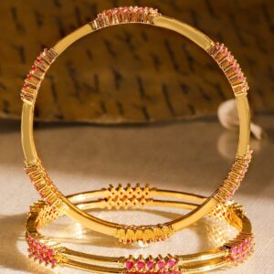 Elevate your look with this set of 4 handcrafted bangles, plated with 22K gold and embellished with dazzling ruby pink stones. A perfect blend of traditional elegance and modern style. Material: Brass Net Weight: 35.46 Gram Net Quantity: 4 Bangles Care Label: It is advisable to avoid contact with water and organic chemicals i.e. perfume sprays. Store jewellery in airtight box. After use, wipe the jewellery with soft cotton cloth.