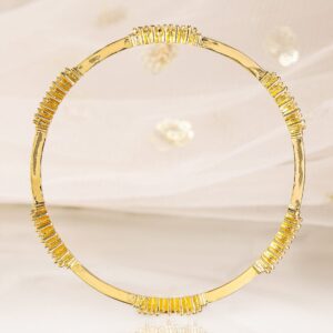 A luxurious set of 4 22K gold-plated handcrafted bangles, beautifully adorned with sparkling cubic zirconia stones. Perfect for adding timeless elegance to your jewelry collection. Material: Brass Net Weight: 36.40 Gram Net Quantity: 4 Bangles Care Label: It is advisable to avoid contact with water and organic chemicals i.e. perfume sprays. Store jewellery in airtight box. After use, wipe the jewellery with soft cotton cloth.