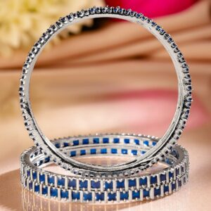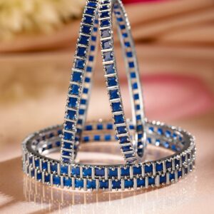 This set of 4 rhodium-plated bangles features deep blue cubic zirconia stones in an elegant, handcrafted design. The premium finish and intricate detailing make these bangles the perfect choice for festive and wedding looks. Occasion : Bring your style to a whole new level with this handcrafted piece of jewellery. When you’re celebrating a special Occasion : – a birthday, wedding, or personal milestone – this piece adds that extra something that makes us feel special and looking our best. Material : & Care Material: Brass Net Weight: 58.38 g Net Quantity: 4 Bangles Care Label : It is advisable to avoid contact with water and organic chemicals i.e. perfume sprays. Store jewellery in airtight box. After use, wipe the jewellery with soft cotton cloth.