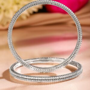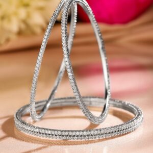 Bangle : This set of 4 handcrafted bangles features a sleek rhodium-plated finish with a delicate row of sparkling white cubic zirconia stones. The ultra-slim design adds a subtle yet sophisticated charm, making it ideal for elegant occasions and layering with other jewelry pieces. Occasion : Bring your style to a whole new level with this handcrafted piece of jewellery. When you’re celebrating a special Occasion : – a birthday, wedding, festive or personal milestone – this piece adds that extra something that makes us feel special and looking our best. Material & Care Material: Brass Plating : Rhodium Plated Net Weight: 36.84 Gram Net Quantity: 4 Bangles Care Label : It is advisable to avoid contact with water and organic chemicals i.e. perfume sprays. Store jewellery in airtight box. After use, wipe the jewellery with soft cotton cloth.