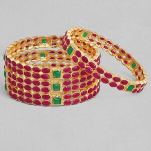 Adorn your wrist with finest handcrafted gold plated bangles studded with¬†Ruby stone Pair it up and flaunt with your ethnic attire. Occasion : Bring your style to a whole new level with this handcrafted piece of jewellery. When you’re celebrating a special Occasion : – a birthday, wedding, or personal milestone – this piece adds that extra something that makes us feel special and looking our best. Material : & Care Material :Brass Care Label : It is advisable to avoid contact with water and organic chemicals i.e. perfume sprays. Store jewellery in airtight box. After use, wipe the jewellery with soft cotton cloth.