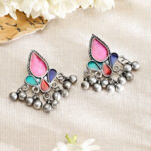 introduces an oxidized silver-plated choker necklace set featuring multicolor enamel work, crescent motifs, silver beads, dangling coins, and matching earrings for a statement ethnic look. Occasion : Bring your style to a whole new level with this handcrafted piece of jewelry. When you’re celebrating a special Occasion : – a birthday, wedding, festive or personal milestone – this piece adds that extra something that makes us feel special and looking our best. Material : & Care Dimension : Length: Necklace 13 cm ; Earrings : 4.5 cm Width : Length: Necklace 30 cm ; Earrings : 2.5 cm Material :Brass Collection : Silver Oxidized Care Label : It is advisable to avoid contact with water and organic chemicals i.e. perfume sprays. Store jewelry in airtight box. After use, wipe the jewellery with soft cotton cloth.