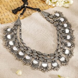 Necklace and Chains : Discover elegance with the Silver-Plated design, meticulously crafted for those who cherish luxury. This piece features precious stones for an eye-catching sparkle, making it perfect for special occasions. With a blend of high-quality materials and exquisite design, it promises both durability and style. The versatile look can complement a variety of outfits, adding a touch of sophistication. A must-have for enhancing your accessory collection with timeless elegance. Occasion : Bring your style to a whole new level with this handcrafted piece of jewellery. When you’re celebrating a special Occasion : – a birthday, wedding, or personal milestone – this piece adds that extra something that makes us feel special and looking our best. Material : & Care Dimension : Length : N; 56CM, Width: W; 2.5 Material :Brass Care Label : It is advisable to avoid contact with water and organic chemicals i.e. perfume sprays. Store jewellery in airtight box. After use, wipe the jewellery with soft cotton cloth.