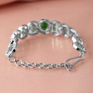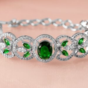 Bracelet : This silver-plated bracelet showcases an elegant design with sparkling cubic zirconia and striking emerald green stones, perfect for adding a touch of glamour and sophistication to any outfit. Occasion : Bring your style to a whole new level with this handcrafted piece of jewellery. When you’re celebrating a special Occasion : – a birthday, wedding, or personal milestone – this piece adds that extra something that makes us feel special and looking our best. Material : & Care Dimension : Length : 20.5cm, Width: 1.5cm Material :Brass Net Weight: 16.40mg Net Qty: 1 Bracelets Care Label : It is advisable to avoid contact with water and organic chemicals i.e. perfume sprays. Store jewellery in airtight box. After use, wipe the jewellery with soft cotton cloth.