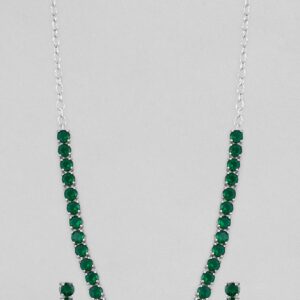 It’s a jewellery set fit for the queens! Exude the royal vibe with this stone studded jewellery set. Consisting of a necklace, matching earrings, this necklace set is crafted from silver-plated copper, stones and beads. Occasion : ¬† Bring your style to a whole new level with this handcrafted piece of jewellery. When you’re celebrating a special Occasion : – a birthday, wedding, or personal milestone – this piece adds that extra something that makes us feel special and looking our best. Material & Care Dimension : Necklace 43 cm; Earrings 2.4 cm Material : Brass Collection : AD(Silver) Net Quantity: 1 Necklace & 1 Pair of Earrings Care Label : It is advisable to avoid contact with water and organic chemicals i.e. perfume sprays. Store jewellery in airtight box. After use, wipe the jewellery with soft cotton cloth