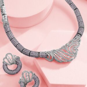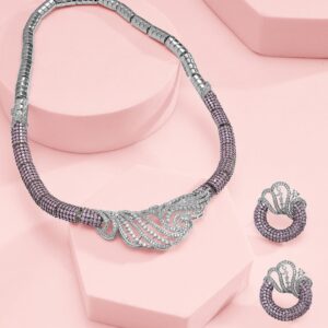 Embrace elegance with this silver-plated statement necklace set from , featuring a captivating artistic wave design studded with AAA Cubic Zirconia and lavender beading. Paired with matching earrings, this luxurious set adds a refined touch to any look. Material : & Care Dimension : Length : NS- 19 ; E- 3 cm Width : NS- 5.5 ; E- 2.5 cm Material : Brass Care Label : It is advisable to avoid contact with water and organic chemicals i.e. perfume sprays. Store jewellery in airtight box. After use, wipe the jewellery with soft cotton cloth.