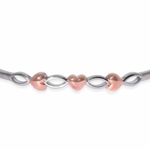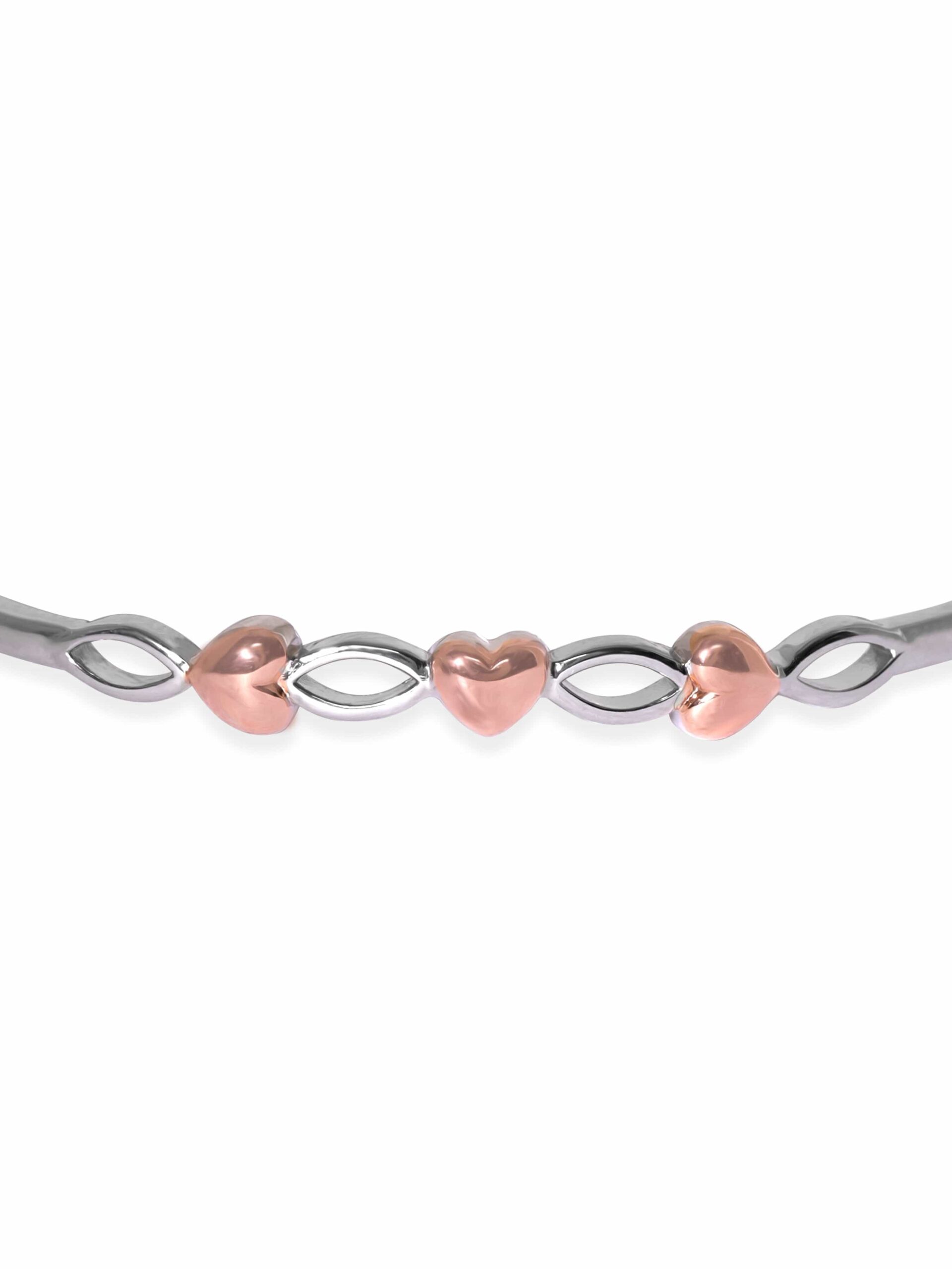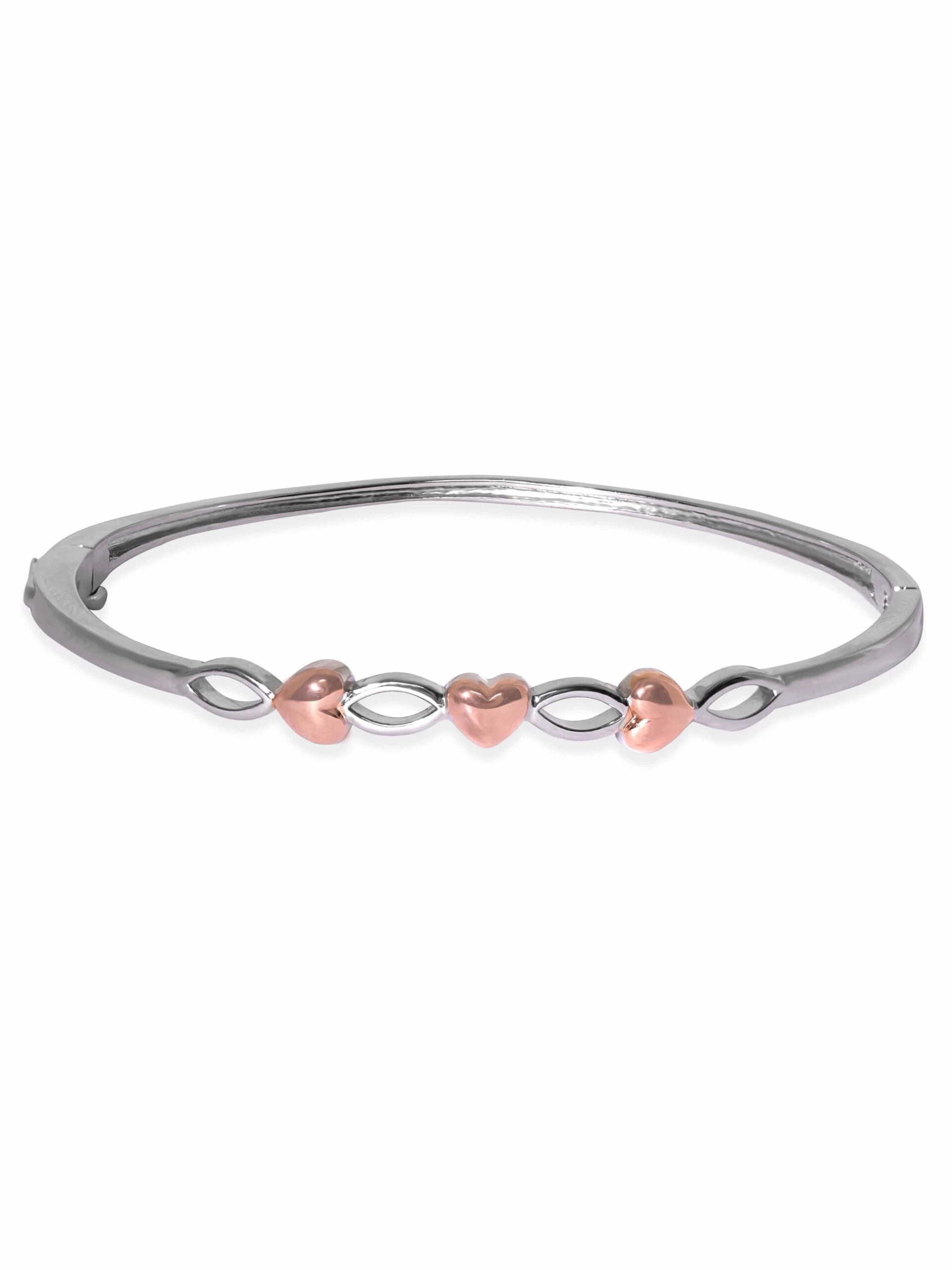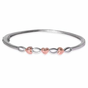 The combination of rhodium plating and rose gold accents adds a touch of elegance and femininity. The bracelet’s understated beauty makes it versatile and suitable for everyday wear or special occasions. Whether worn alone or layered with other bracelets, this piece is a timeless addition to your jewelry collection, symbolizing love and style in a simple yet elegant manner. Material & Care Dimension : Free Size Material : 925 Silver Weight : 7.9g Net Qnty : 1 Bracelet Care Label : It is advisable to avoid contact with water and organic chemicals i.e. perfume sprays. Store jewellery in airtight box. After use, wipe the jewellery with soft